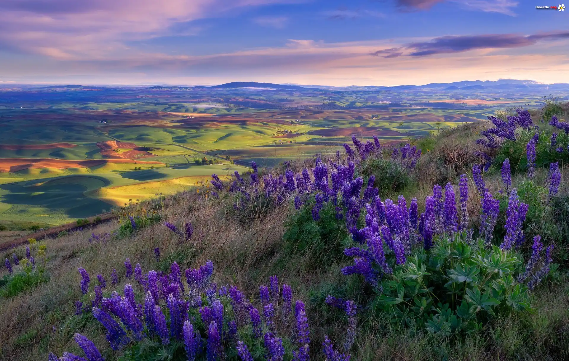 Kwiat Wzgórza, Pola, Domy, Kwiaty, Łubin