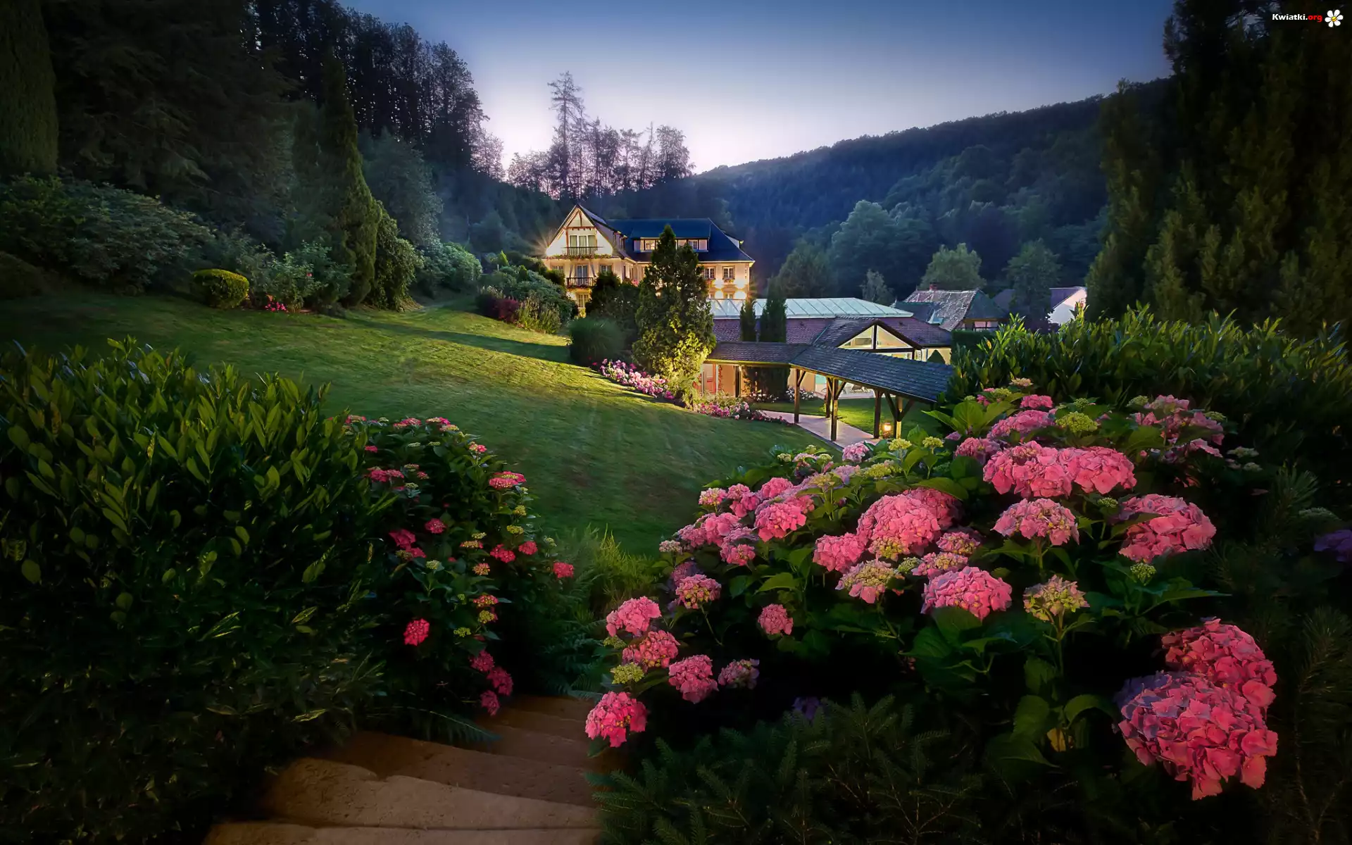 Kwiaty, Dom, Ogród, Hortensje, Zmierzch, Drzewa, Krzewy, Wzgórza - Zdjęcia
