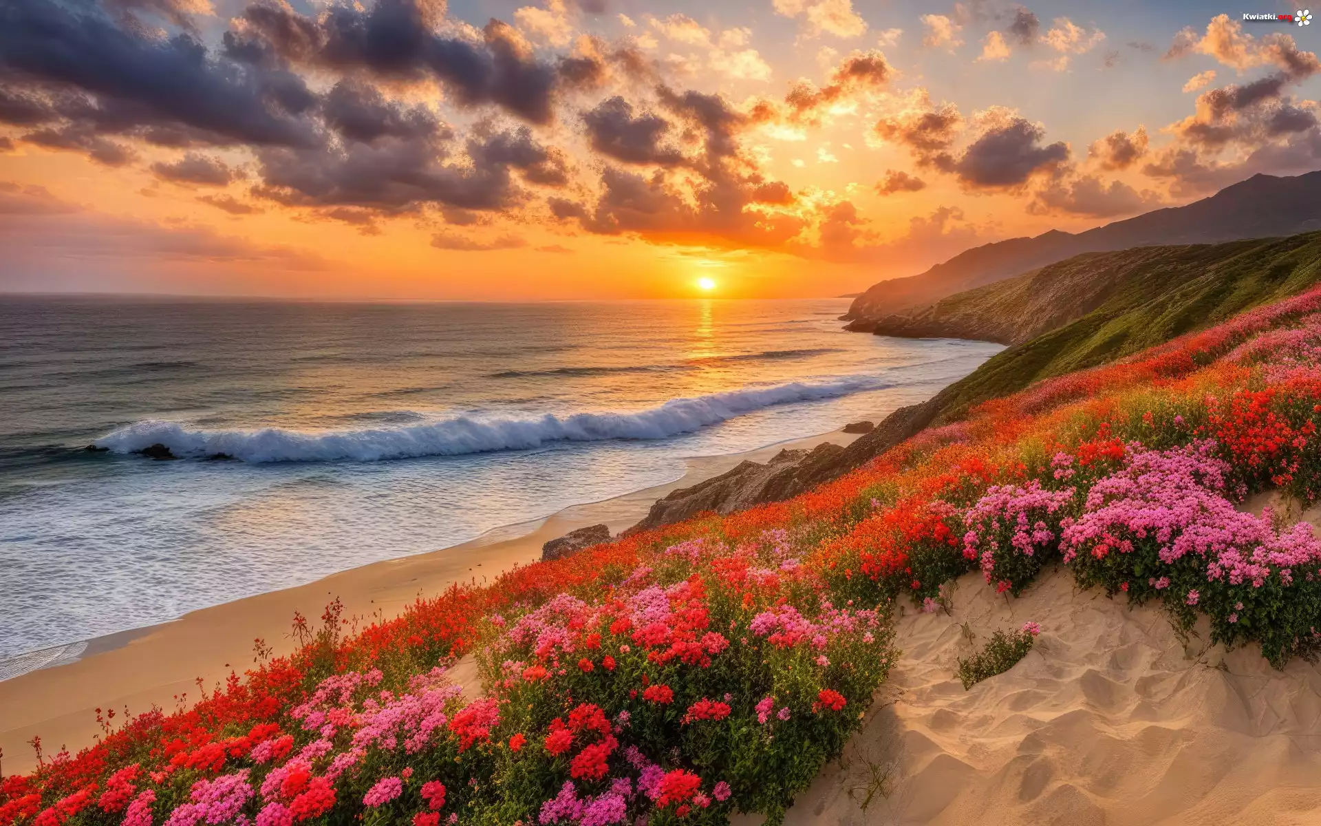 Kwiat Morze, Zachód słońca, Wzgórza, Kwiaty, Wybrzeże