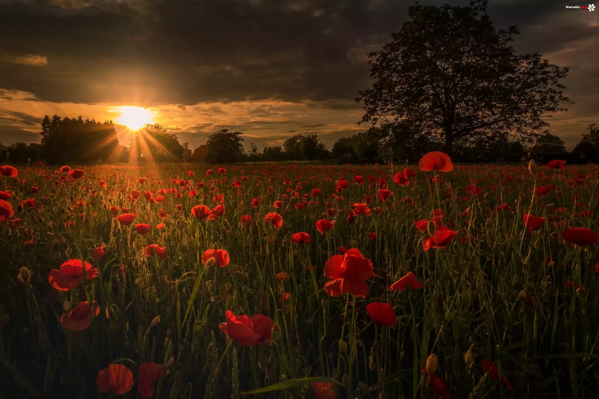 Zachód słońca, Drzewa, Maki - Zdjęcia