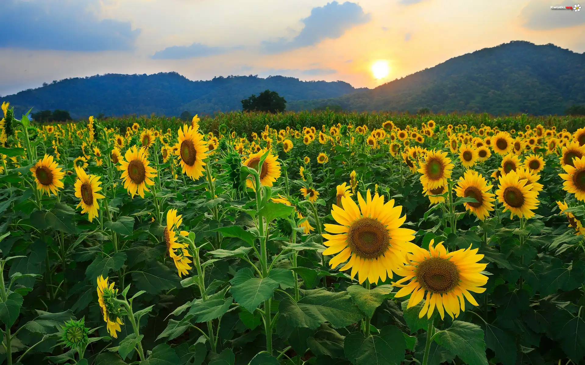 Zachód, Słońca, Góry, Słoneczniki - Zdjęcia