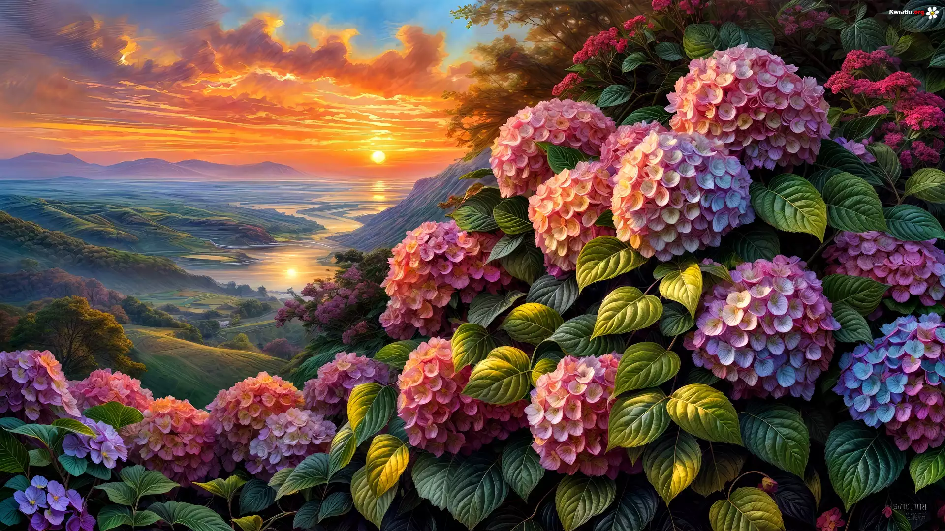 Kwiat Hortensje, Kwiaty, Dolina, Zachód słońca, Grafika