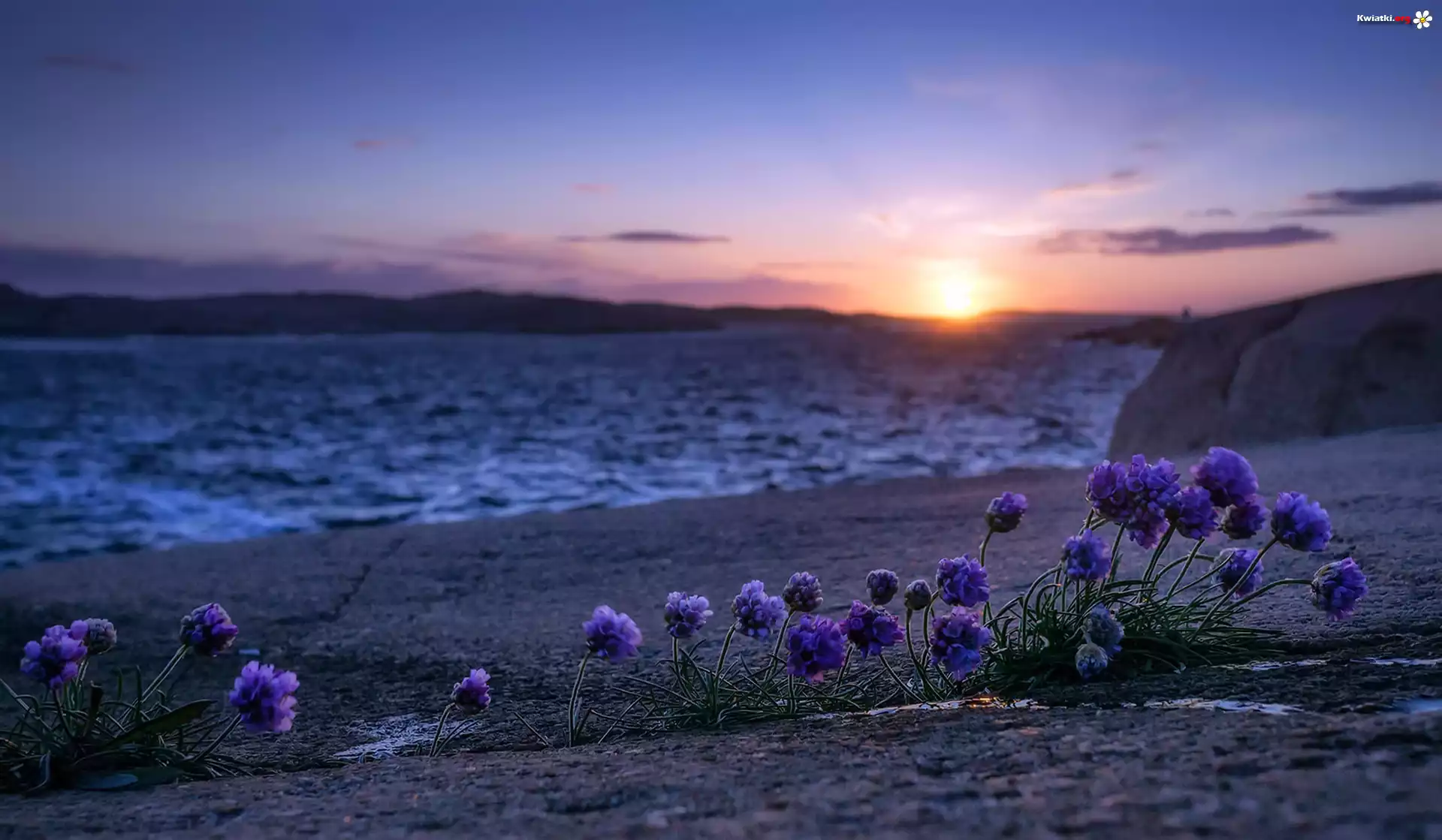 Zachód słońca, Jezioro, Kwiaty, Plaża - Zdjęcia