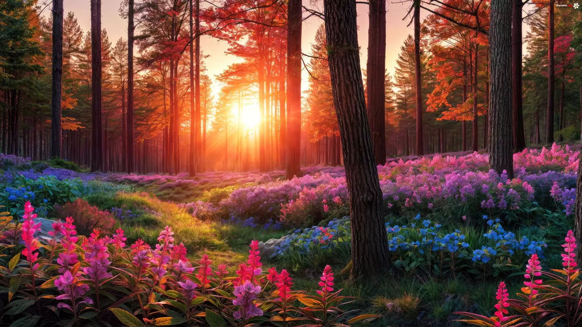 Las, Kolorowe, Kwiaty, Zachód słońca, Drzewa, Grafika - Zdjęcia