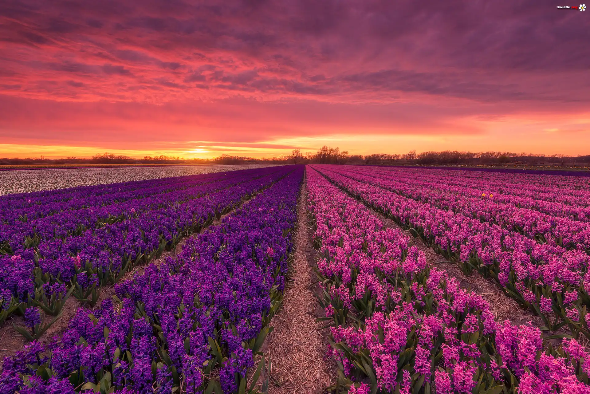 Zachód słońca, Pole, Kwiaty, Hiacynty - Zdjęcia