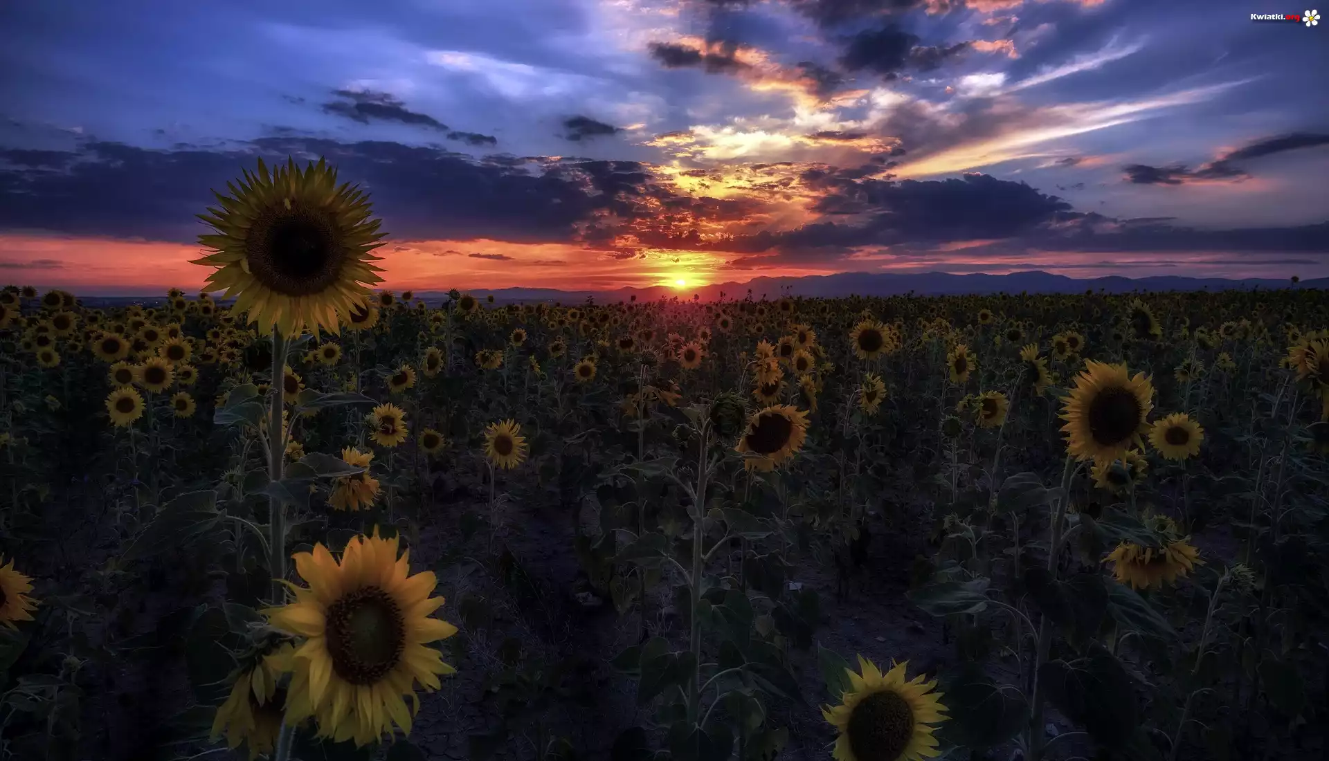 Zachód słońca, Pole, Kwiaty, Słoneczniki - Zdjęcia