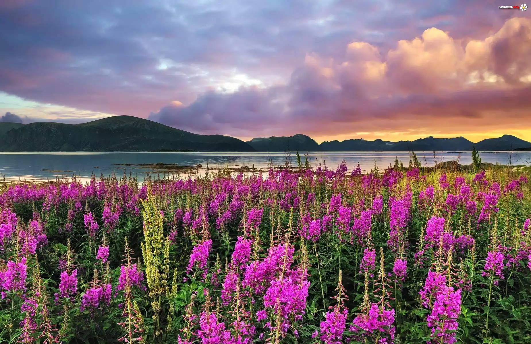 Zachód, Słońca, Kwiaty, Jezioro - Zdjęcia