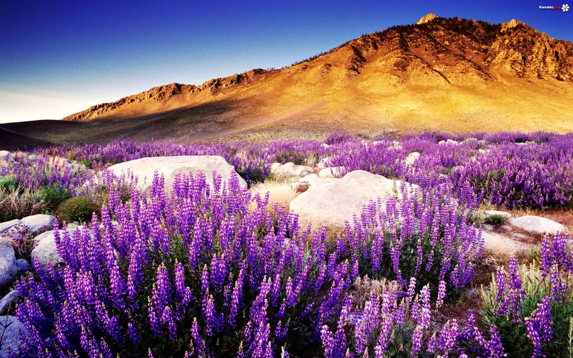 Kwiat Zachód, Słońca, Wzgórza, Głazy, Kwitnący, Łubin