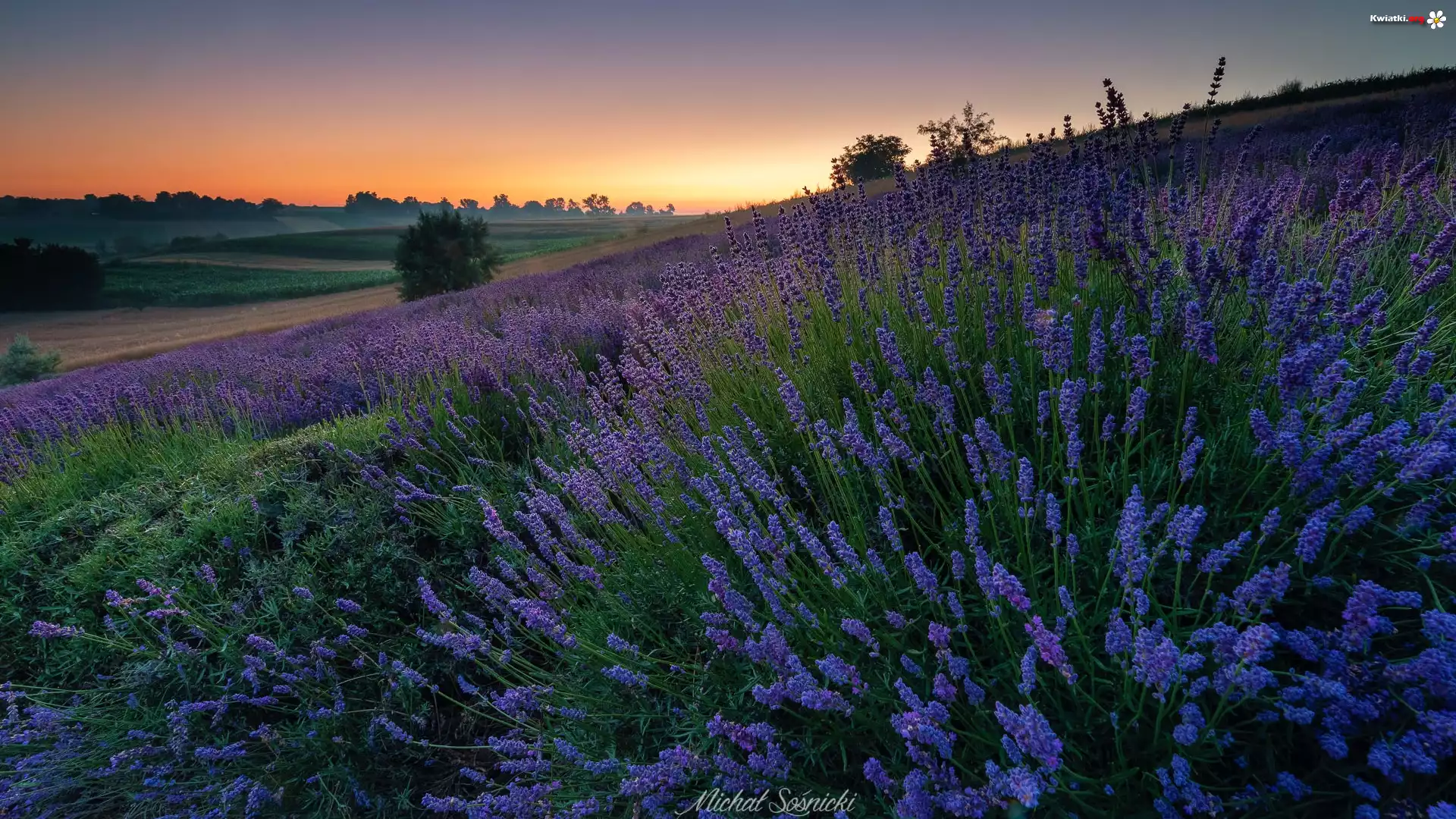 Kwiat Łąka, Lawenda, Drzewa, Zachód słońca