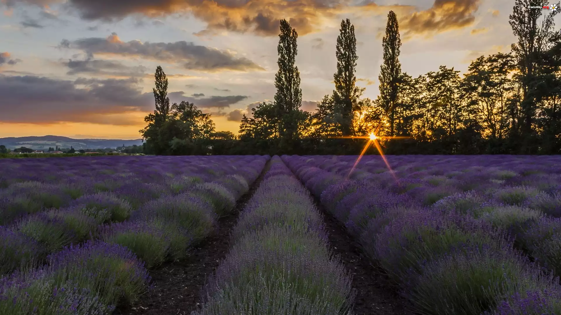 Kwiat Zachód, Słońca, Promienie, Lawenda, Drzewa