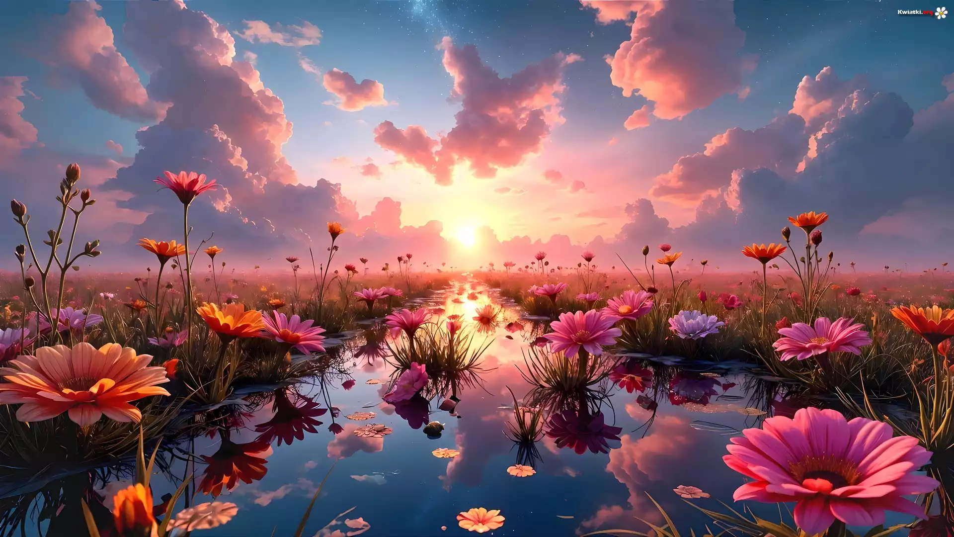 Kwiat Kwiaty, Woda, Odbicie, Zachód słońca, Grafika AI