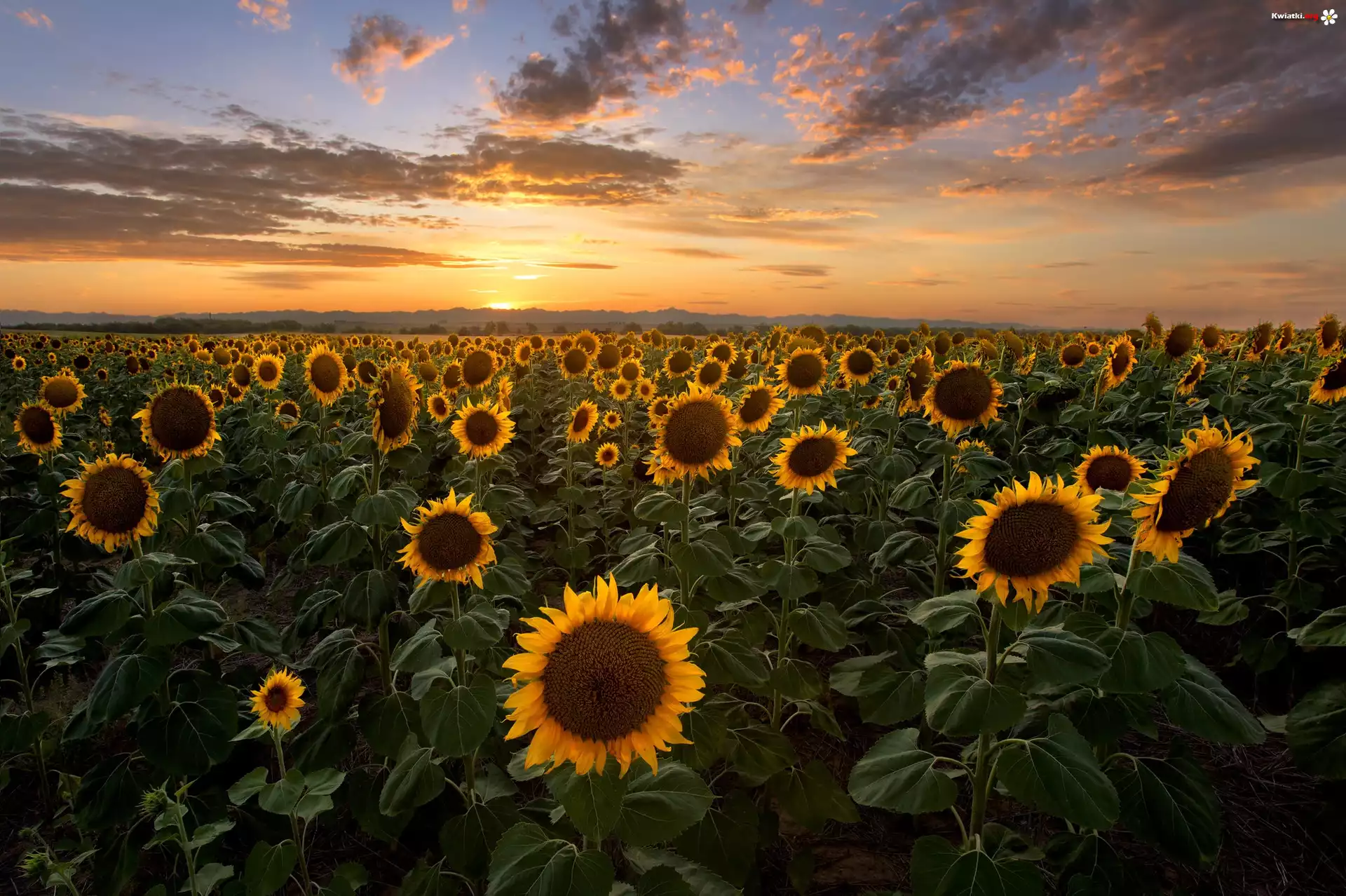 Zachód słońca, Pole, Kwiaty, Słoneczniki, Chmury - Zdjęcia