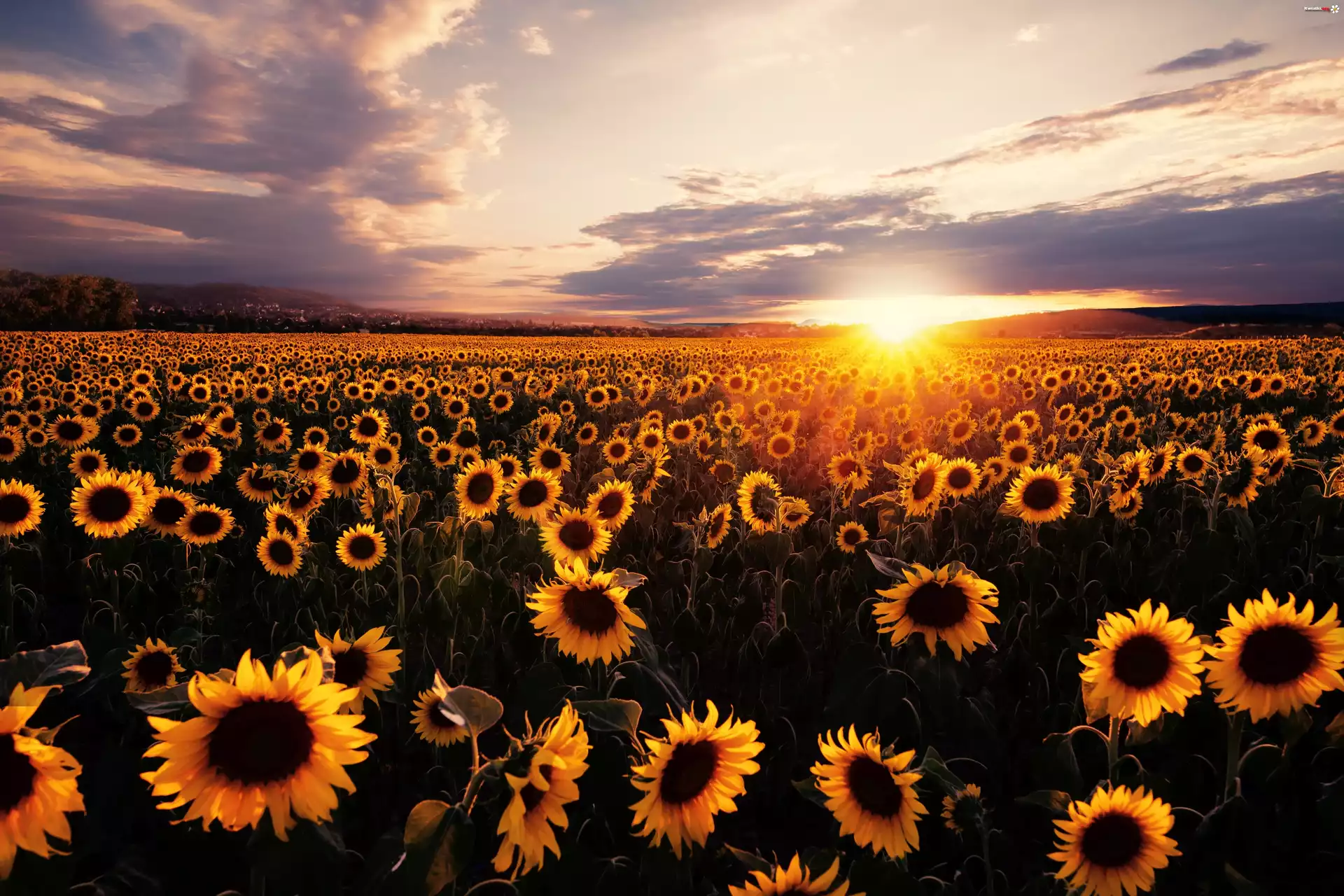 Kwiat Zachód Słońca, Pole, Słoneczniki, Chmury