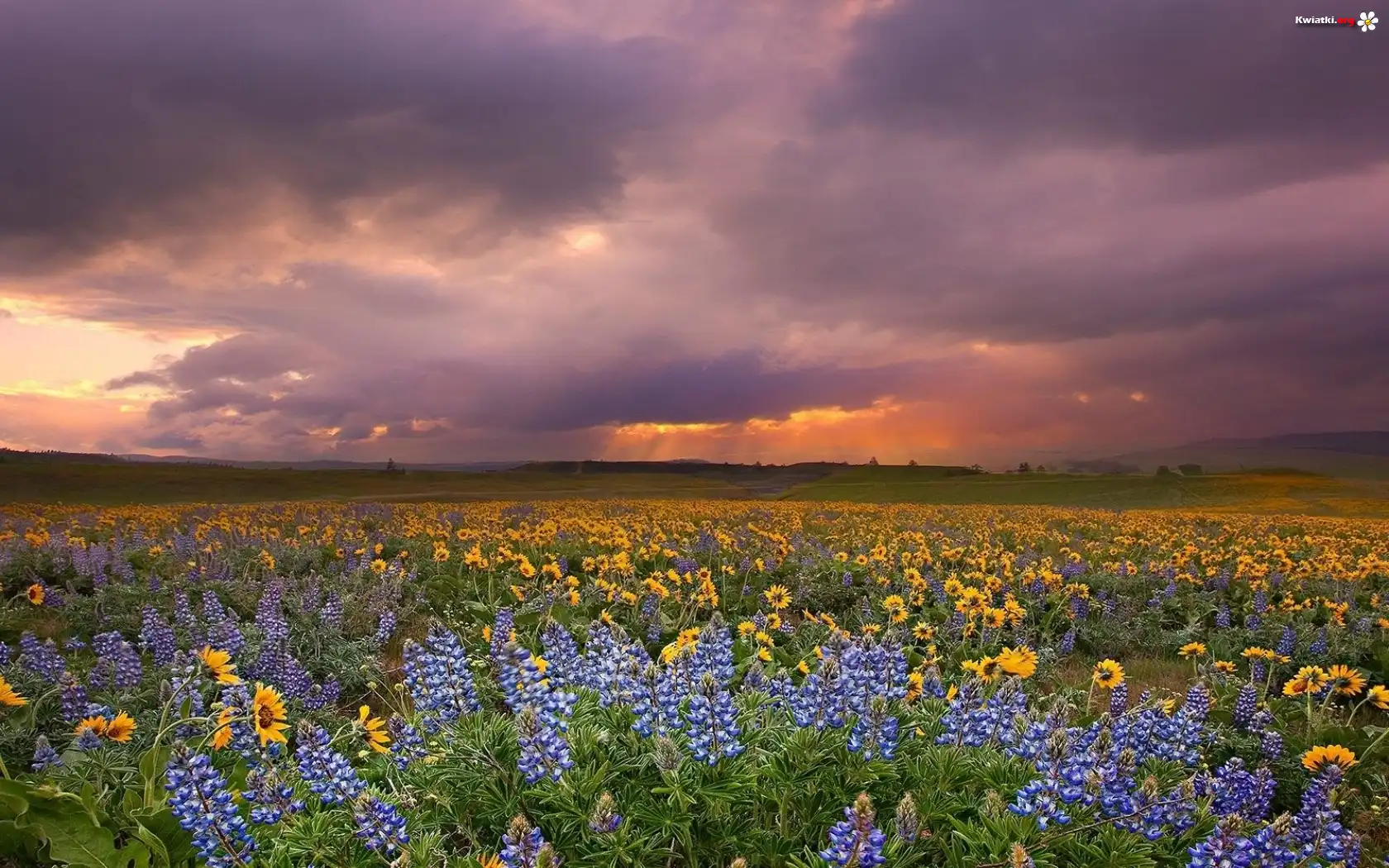 Zachód, Słońca, Słoneczniki, Łubin - Zdjęcia