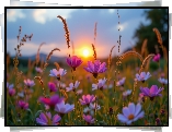 Łąka, Kosmea, Trawy, Zachód słońca, Grafika AI - Zdjęcia