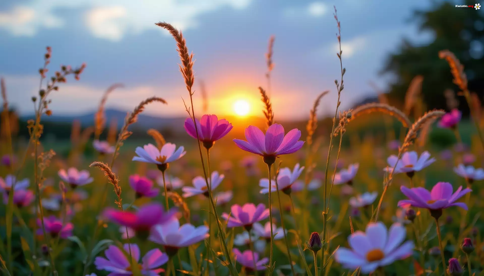 Kwiat Łąka, Kosmea, Trawy, Zachód słońca, Grafika AI