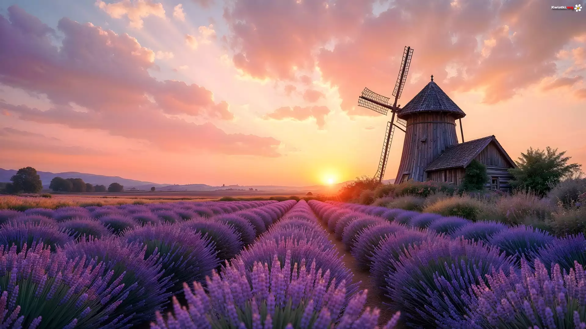 Kwiat Lawenda, Pole, Wiatrak, Zachód słońca, Grafika AI