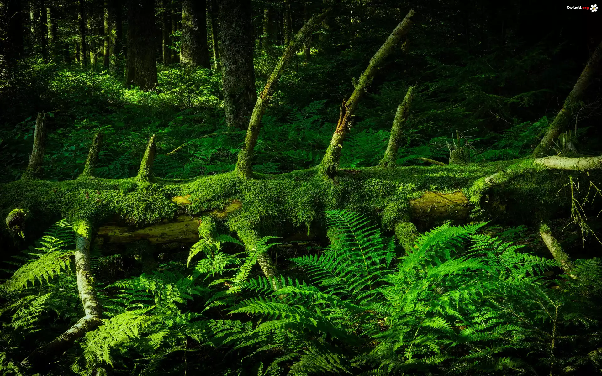 Kwiat Las, Zarośla, Drzewa, Drzewo, Powalony, Omszały, Pień, Paprocie