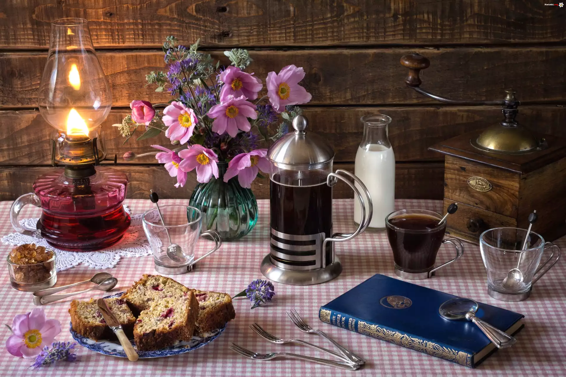 Kwiat Kompozycja, Zawilce, Bukiet, Flakon, Lampa, Książka, Młynek, Kawa