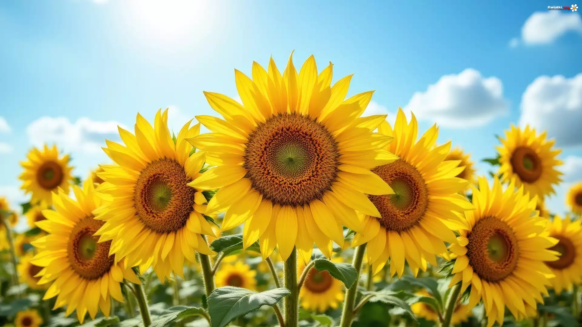 Kwitnące, Słoneczniki, Niebo, Zbliżenie - Zdjęcia