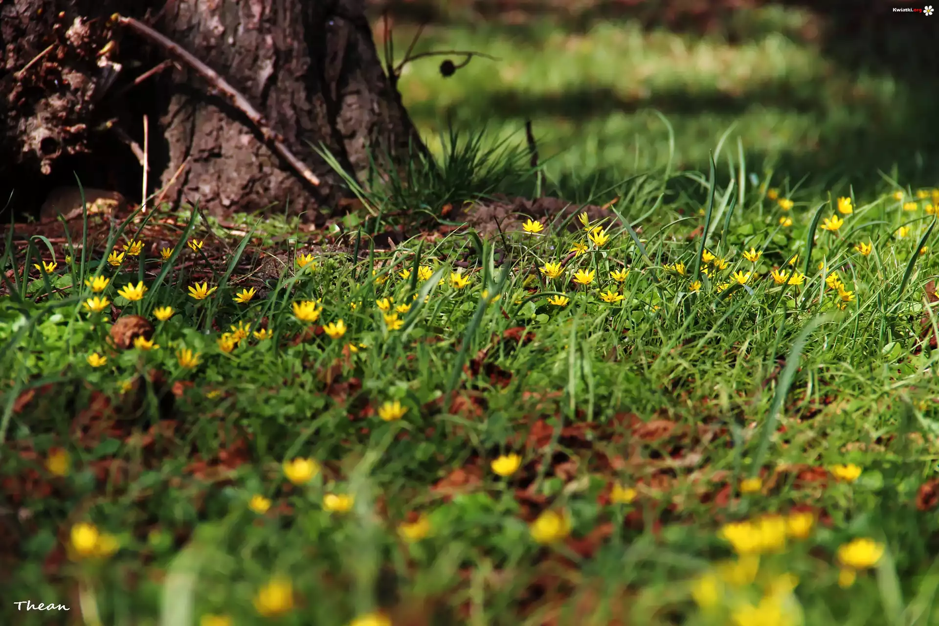 Ziarnopłon Wiosenny, Żółte, Kwiaty, Trawa, Drzewo - Zdjęcia