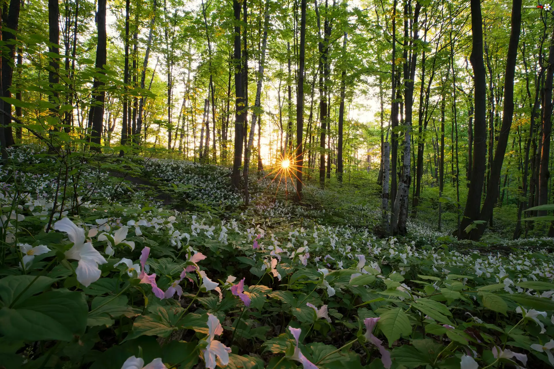 Kwiat Las, Drzewa, Kwiaty, Zieleń, Promienie słońca