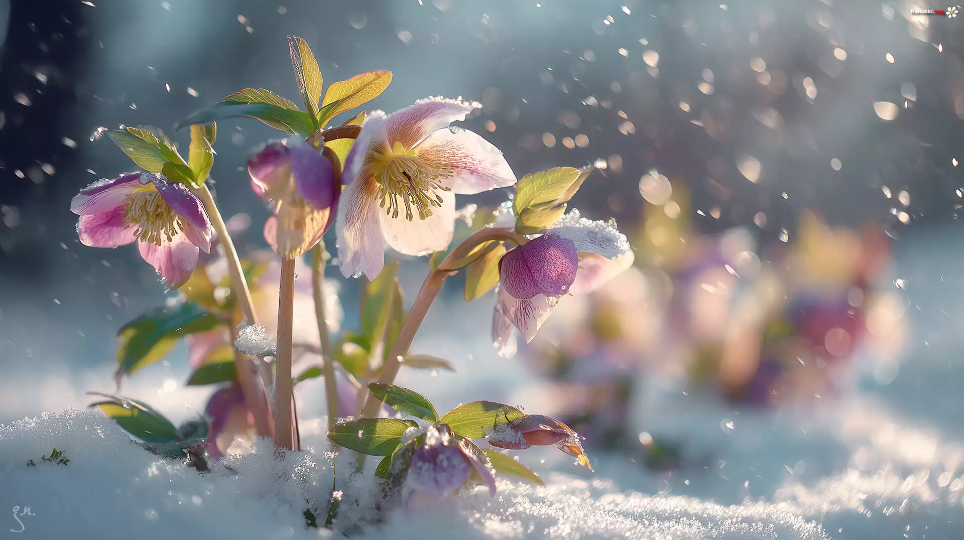 Różowe, Ciemierniki, Śnieg, Zima, Grafika AI - Zdjęcia