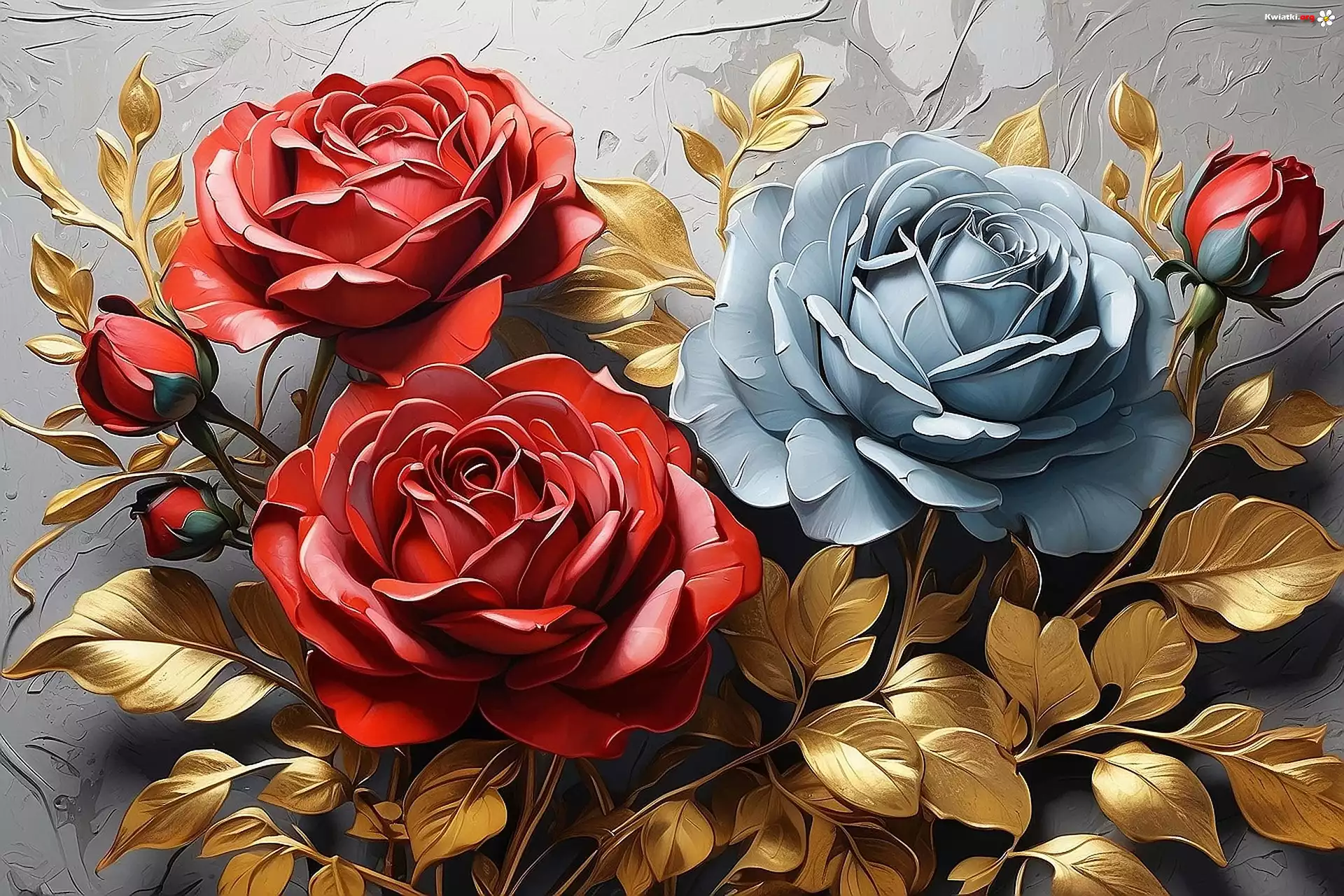 Róże, Czerwone, Niebieska, Złote, Liście, Grafika - Zdjęcia