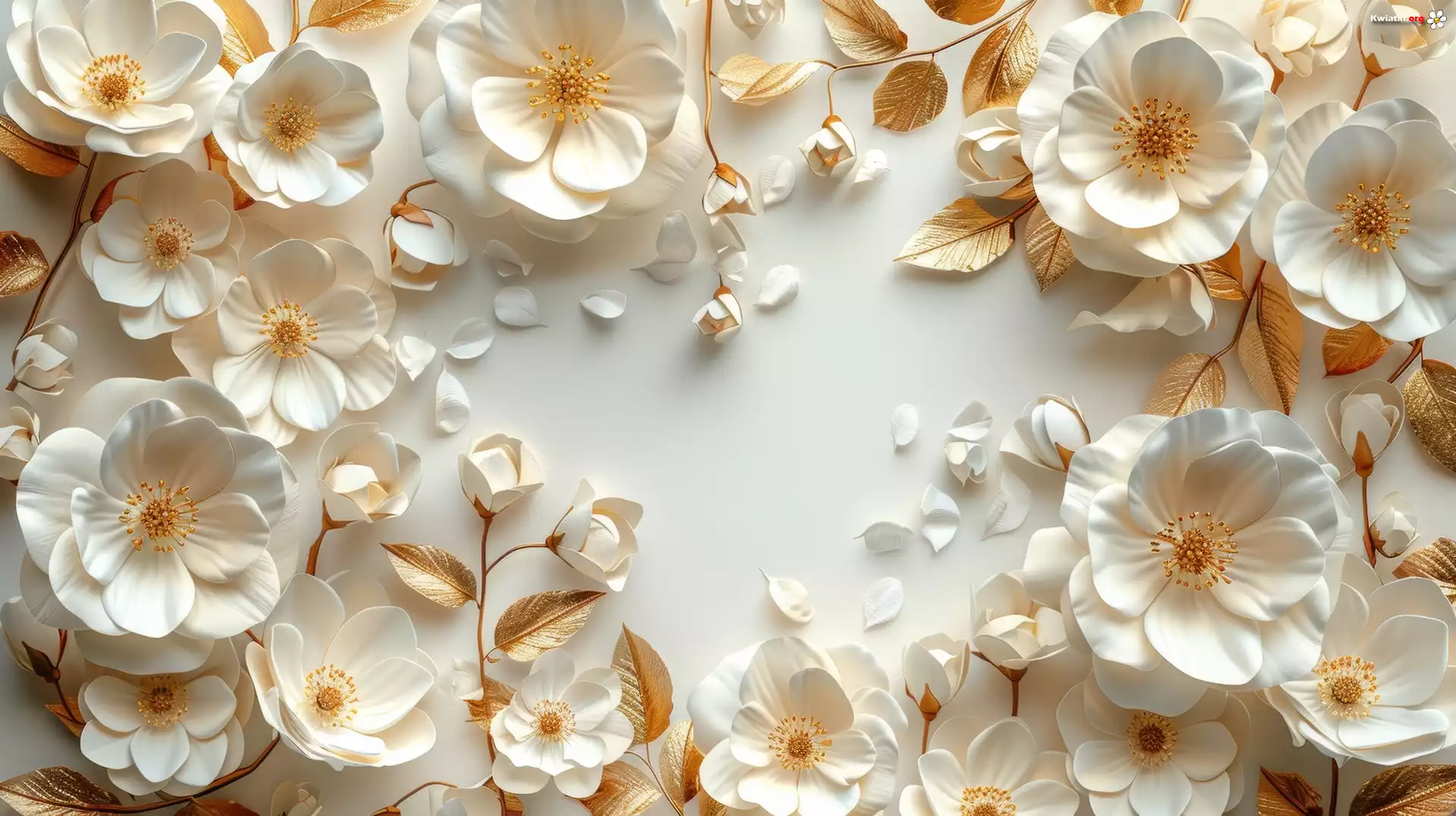 Białe, Złote, Kwiaty, Liście, Grafika - Zdjęcia