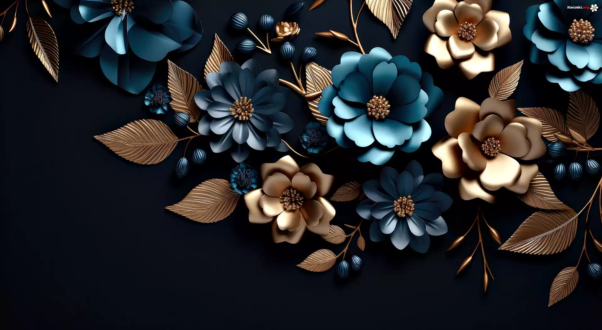 Niebieskie, Złote, Kwiaty, Liście, Grafika - Zdjęcia