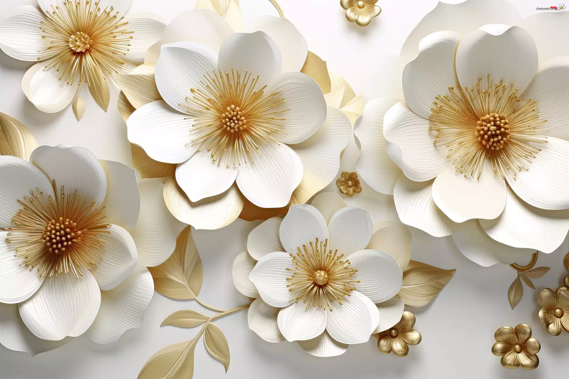 Biało-złote, Kwiaty, Listki, Grafika - Zdjęcia