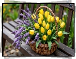 Wiklinowy, Koszyk, Kwiaty, Żółte, Tulipany, Lawenda, Ławka - Zdjęcia