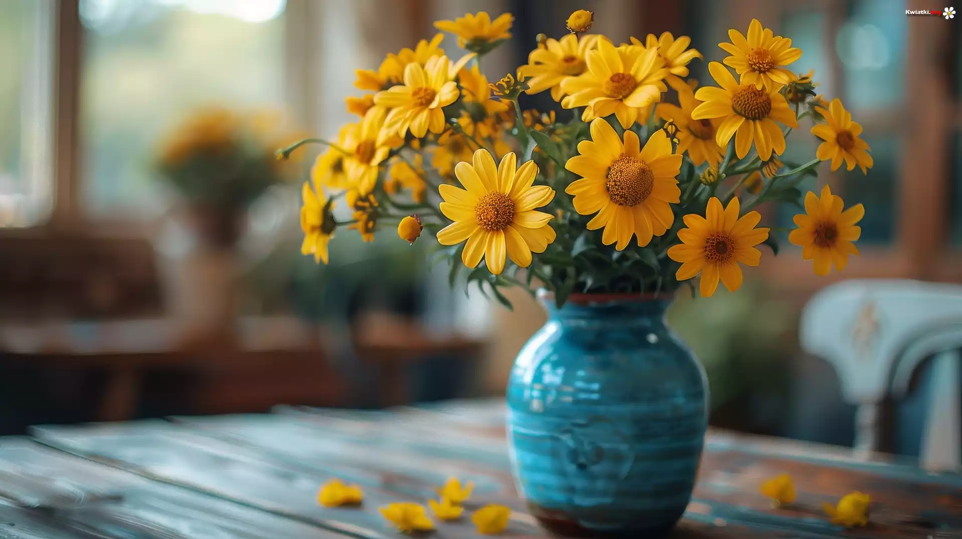 Kwiat Bukiet, Żółte, Kwiaty, Niebieski, Wazon