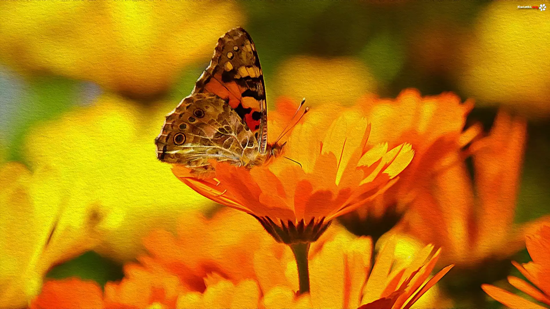 Zółte, Kwiaty, Motyl, Tekstura - Zdjęcia