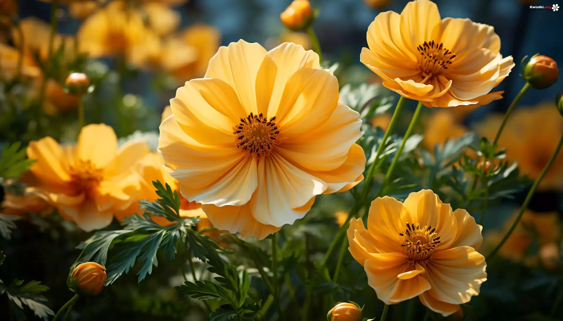 Kwiaty, Żółte, Pąki, Liście, Kosmea - Zdjęcia