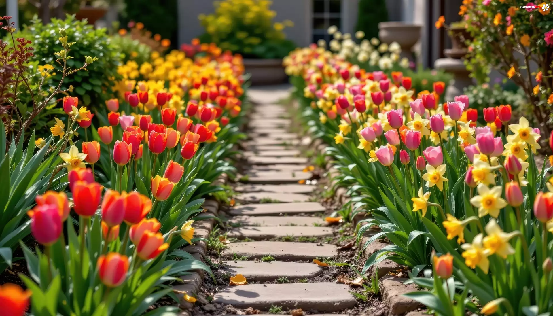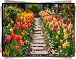 Kwiaty, Tulipany, Narcyzy żonkile, Ścieżka, Ogród - Zdjęcia